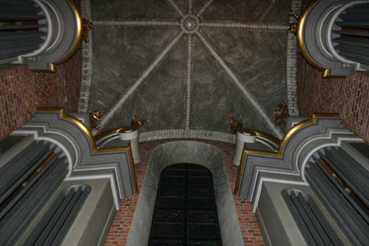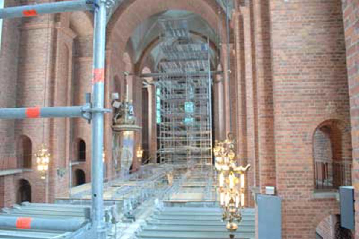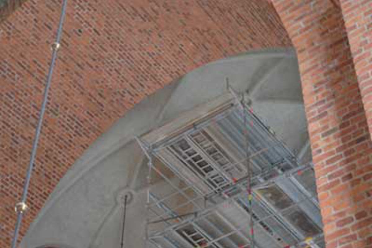 Utförande: Rengöring av samtliga valv (tak) 22 meter högt invändigt med svamp, samt lagning av sprickor. Lagat och kalkat den utvändiga listen runt om kyrkan.