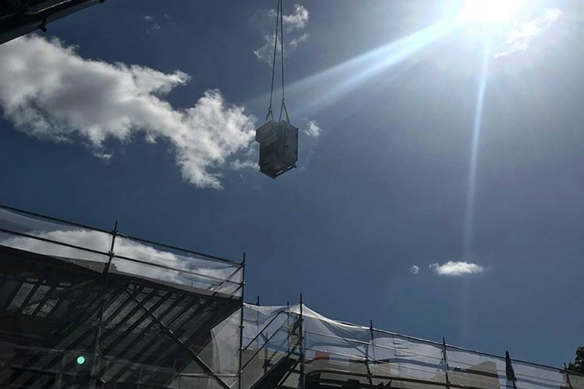 Ingen stång i Norrköping, men väl en vacker mobilkran som lyfter in ännu ett Fläkt Woods aggregat. Snyggt jobb av Provent i ett av Eklöfs Fastigheters hus.